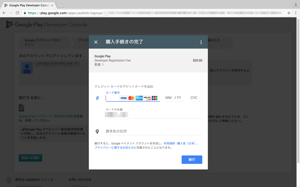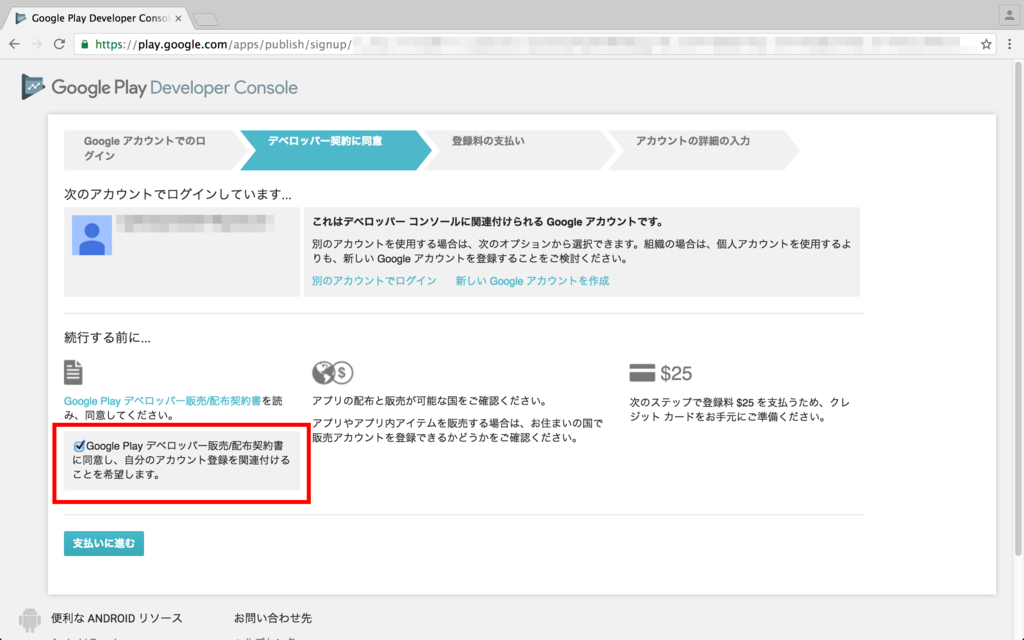 Google Playデベロッパー販売配布契約書に同意をして支払いに進みます。