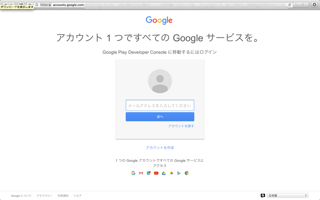 既にGoogleアカウントでログイン済みの場合はこのページは飛ばされて次に進んでしまいます。注意点としては、一人で複数のGoogleアカウントを持っていた場合、ここでログインしたアカウントだけがデベロッパーアカウントに紐づくという点です。デベロッパーアカウントに紐付けたいGoogleアカウント以外でログインしてしまった人は別のアカウントでログインし直してください。